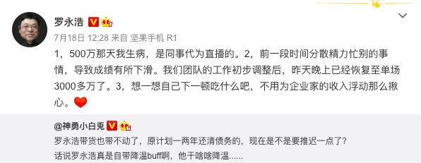 在断崖式下跌后,对老罗的唱衰声开始响起。但老罗表示,这是因为团队初期有太多事情要忙碌,导致带货成绩有所下滑,如今团队已经做好了准备,未来的成绩将会回升。