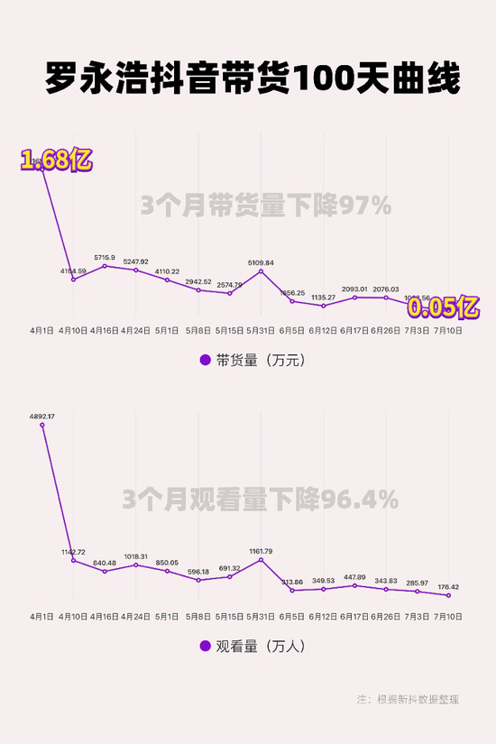 但在当月榜单中,老罗的成交金额仅有5500万,在胖球数据等机构统计的全网七月排行中,老罗位列33名,哪怕在抖音内部也只能拿到第8位。宣传机器在不断刺激,“罗粉”们的购买潜力却已经达到了极限,7月10日,老罗单场交易金额仅有500万,相较第一场下降了97%。