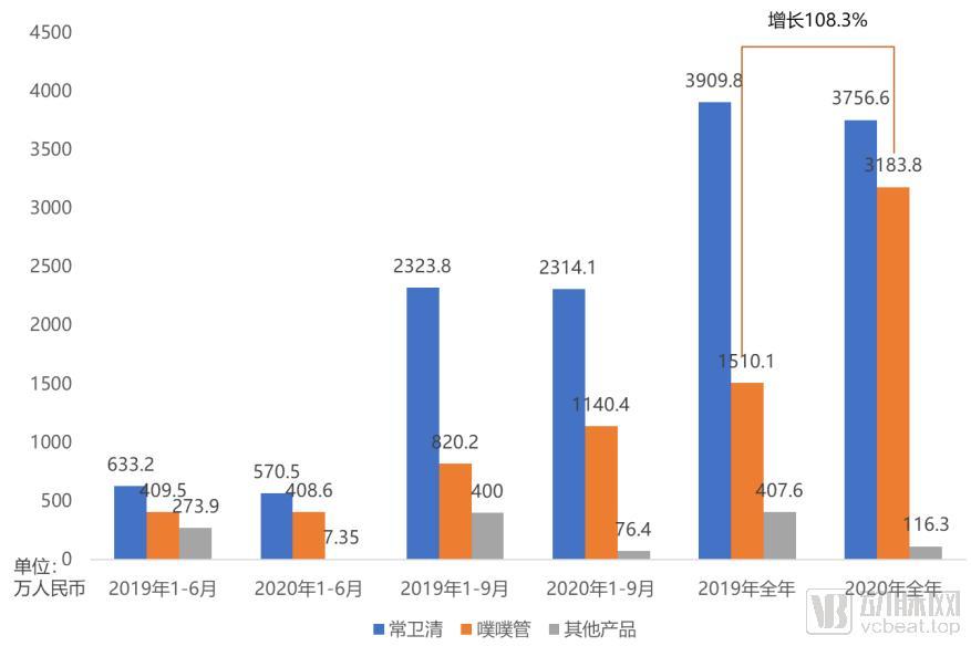 可以看到,在1-6月和1-9月两个时间段上,诺辉健康在2019年和2020年的营收结构基本一致,以常卫清为主,噗噗管为辅,其他产品营收较低。在这两个时段中诺辉健康的营收总额也基本一致。