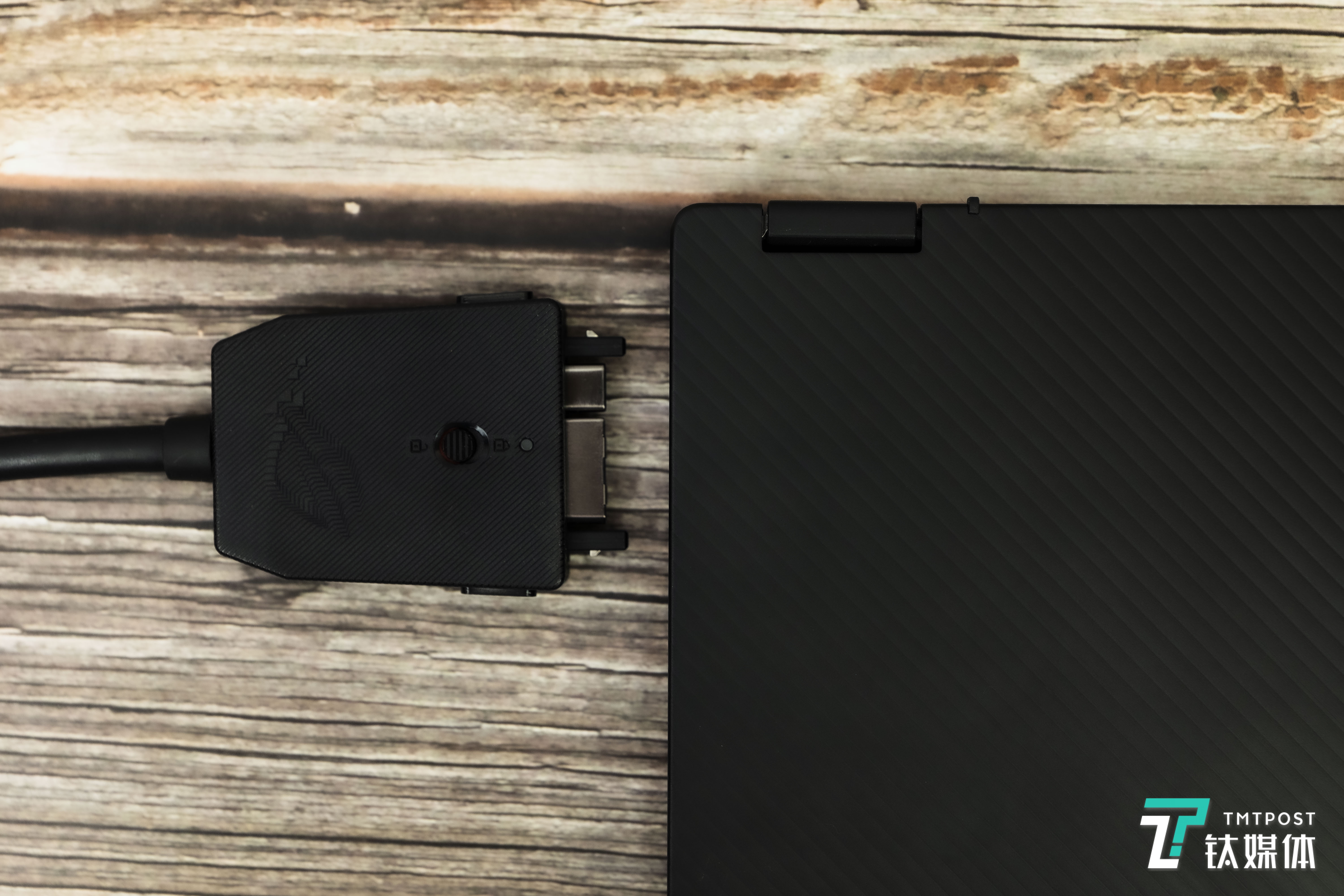 左下角的金属铭牌上镌刻的Republic of Gamers,也是让你确信,这是一台披着轻薄本外衣的游戏本。至于侧面接口方面,一个标准HDMI接口加上耳麦口,USB 3.1 Type-A 接口,以及两个雷电3标准的USB-C——其中一个与PCIe 3.0×8的拓展坞接口并列在了一起,如果不仔细看,很容易把它忽略掉。![]()