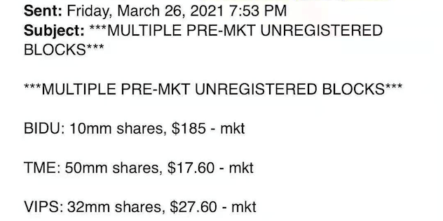 作者收到的截图显示,美股盘前8点左右,国际投行高盛给机构投资人的询价邮件中显示,市场出现大宗卖单(Block Trade),分别是185美元每股的百度1000万股,17.60美元每股的腾讯音乐5000万股,和27.60美元每股的唯品会3200万股。该询价和个股前一日的收盘价格相比分别折价9.6%,14%和14%。