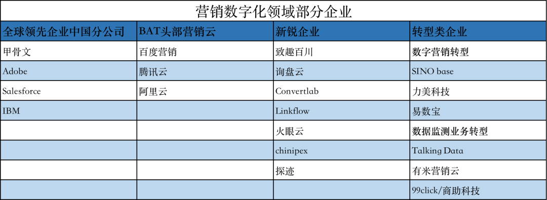 目前,国内营销数字化厂商主要有四类,分别是全球领先营销SaaS企业中国分公司、BAT头部营销云、新锐营销SaaS企业以及从传统数字营销和数据监测业务转型的营销SaaS企业。