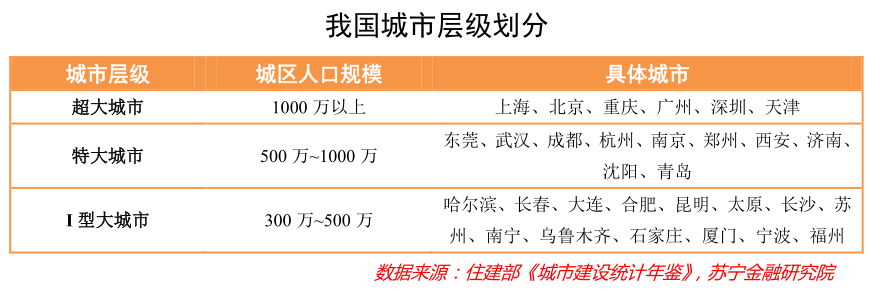 具体在城市层级划分上,参考2014年11月国务院发布的《关于调整城市规模划分标准的通知》,城区常住人口 100万~500万的城市为大城市,其中300万~500万的城市为Ⅰ型大城市,100万~300万的城市为Ⅱ型大城市;城区常住人口500万~1000万的城市为特大城市;城区常住人口1000万以上的城市为超大城市;城区常住人口在100万以下的则属于中小城市。