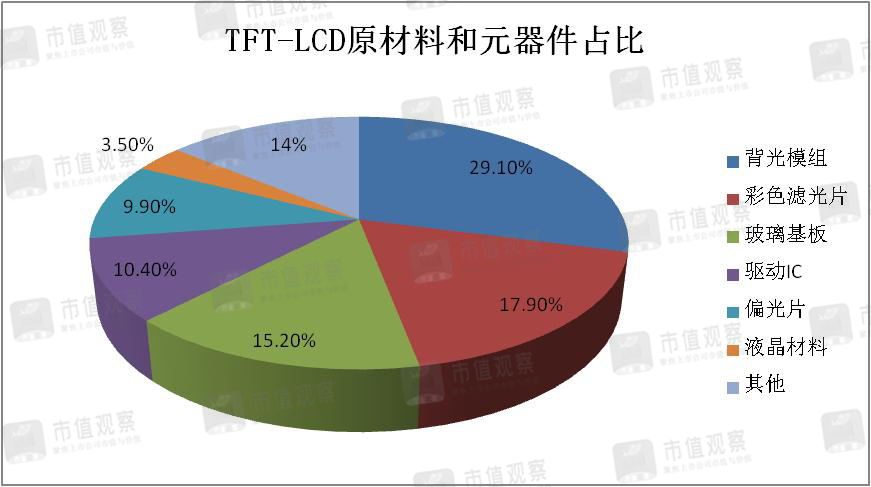 解构产业链可知,面板上游主要包括背光模组、彩色滤光片、玻璃基板、驱动IC、偏光片、液晶材料等,成本占比依次为29.1%、17.9%、15.2%、10.4%、9.9%、3.5%。