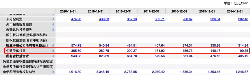 2019年少数股东权益占比再度增加到34%,达到282.75亿元,同比增加了82.48亿元。
