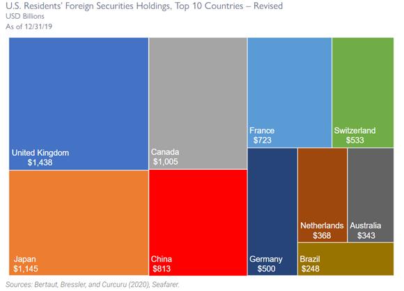 More recent research by an investment adviser, Seafarer Capital Partners, has a similar conclusion and gives a more updated figure that American investors' total holding of Chinese securities is estimated at US$ 813 billion, more than 3.5 times the official figure, which makes China the fourth largest foreign exposure for the U.S.