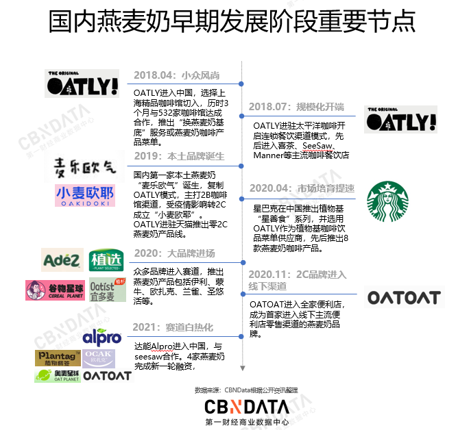 燕麦奶是2018年在中国横生的全新品类,而开始进入大众视野是从星巴克于2020年4月推出OATLY燕麦奶拿铁开始的,也正是这个时间点,植物奶市场的产品和品牌发生了更迭,植物酸奶、豆奶等产品在健康性创新方面也有了突破发展,促活了长期停滞增长的中国植物奶市场。另外,燕麦奶咖啡持续的市场培育促进了燕麦奶零售消费场景的发展,燕麦奶也开始了2B和2C模式下的创新、发展、差异化竞争。
