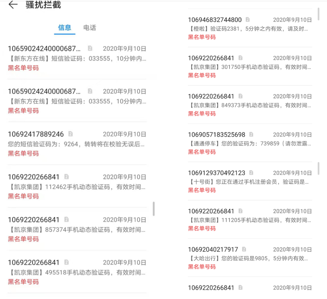 她发来的截图显示,仅2020年9月10号这天,她就收到了来自不同发送方的六十多条验证码。这还不是全部,她时常接到催债电话,“有一次我说号码换人了,他可能一听是个小姑娘就跟我兜圈子,骚扰我,被我痛骂一顿挂了。太心酸了,后来我就没用那个号码了。”