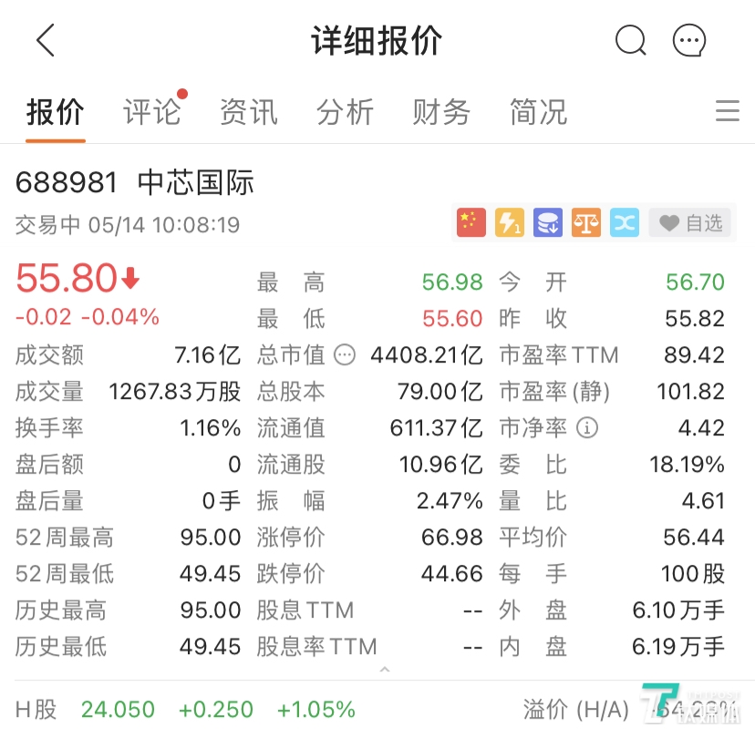 截止发稿前,中芯国际港股(0981.HK)报24.05港元/古,涨幅1.05%,市值为1899亿港元;中芯国际科创板(688981.SH)则报55.80元/股,下跌0.04%,市值超过4408亿元人民币。