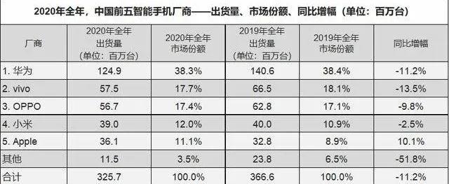 IDC数据显示,2019年国内手机市场剔除五大头部品牌之后,其他尾部品牌总出货量为2380万部,瓜分6.5%的市场份额。2020年,尾部生存空间减半,总出货量为1150万部,同比下跌51.8%。