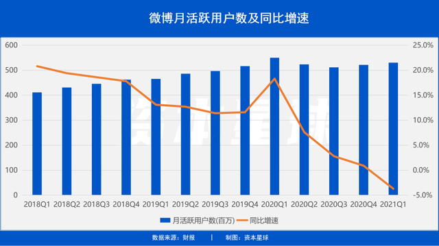 那个季度,微博月活用户净增8500万,规模达5.5亿,刷新公司历史新高。但在随后的几个季度里,微博月活用户数摸高下落。随着中国疫情迅速得到控制,户外活动逐渐恢复,微博的用户增速出现明显下滑。到了今年一季度,微博月活数量下降到5.3亿,同比下降近4%,日活数据同比也下降了5%。更加不乐观的是,过去三年里微博月活用户增速整体也呈震荡下滑趋势。