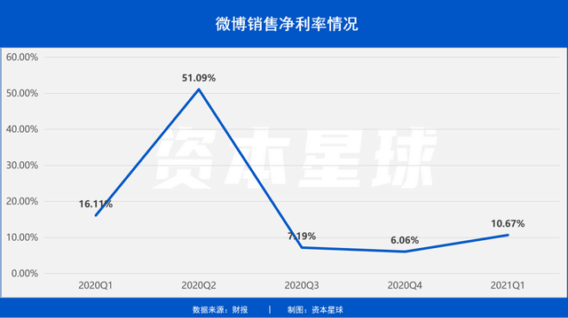 但是,与营收大涨形成鲜明对比的是,微博一季度净利润出现明显下跌,呈现“增收不增利”的态势。财报显示,2021年一季度微博归母净利润4982万元,较上年同期的5210万美元下降了4.39%。利润率方面,过去的三个季度微博净利润率较此前明显收窄。