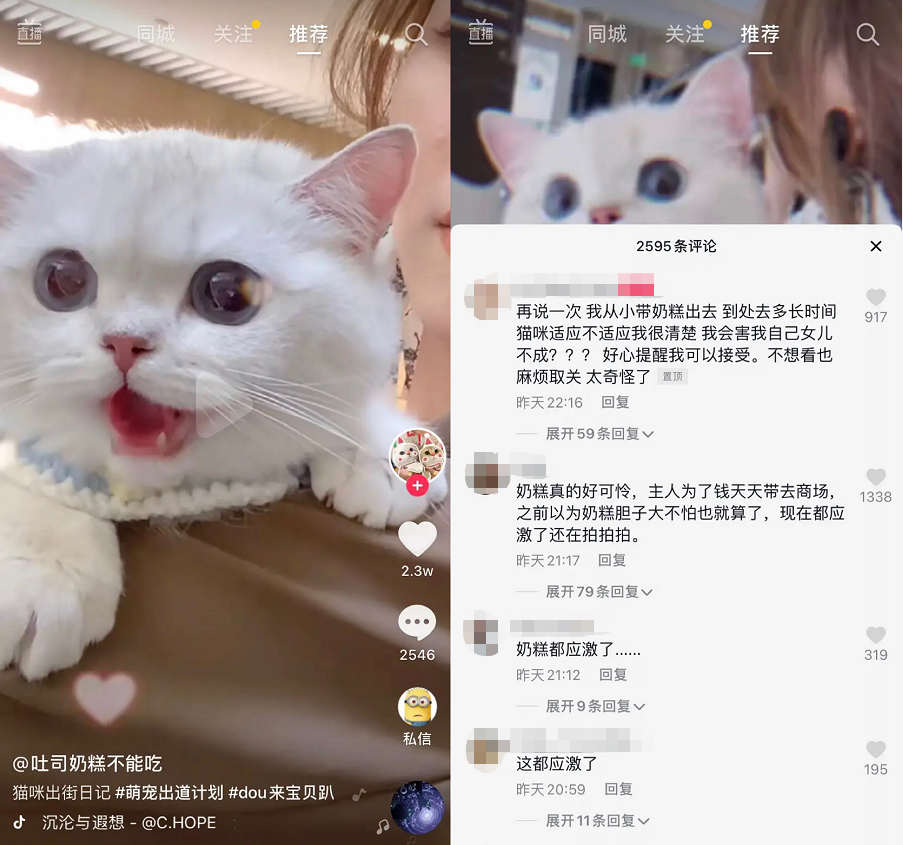 在抖音博主“吐司奶糕不能吃”的评论区,经常有网友质疑博主带猫咪外出到陌生环境可能会有应激反应,博主本人也进行了回应,但谁是谁非似乎也很难说清。