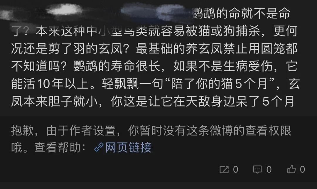 过了一段时间,玄凤鹦鹉消失在视频中。对此,博主并没有出面进行解释,有网友指责博主“让鹦鹉在天敌身边呆了5个月”。