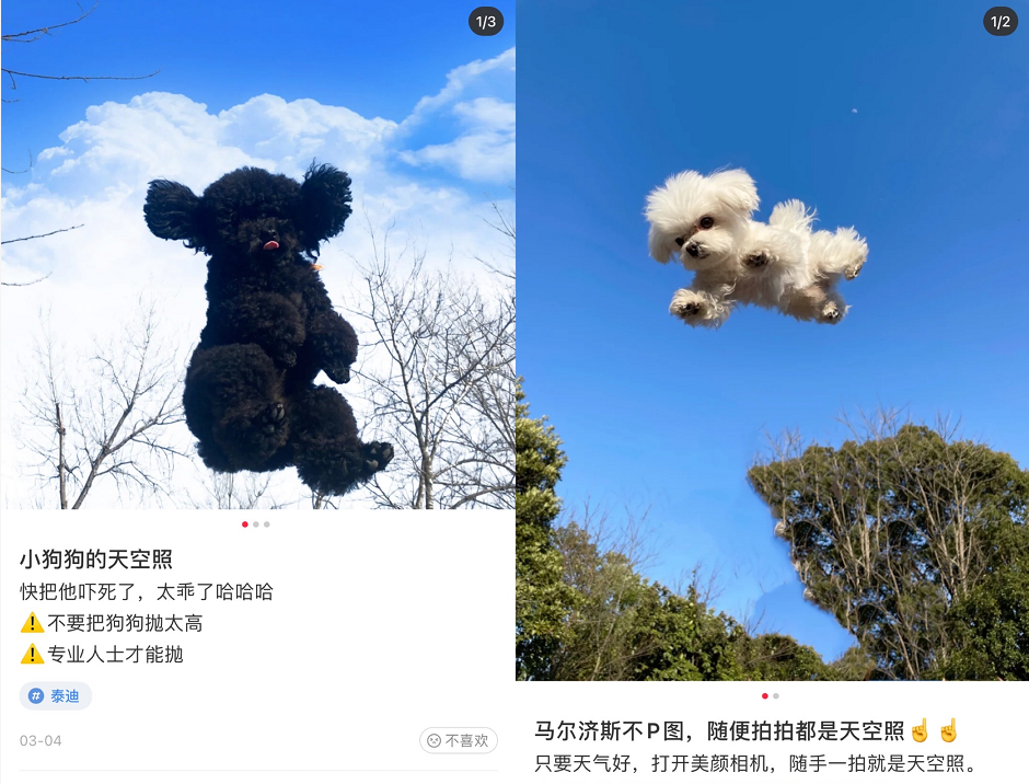 前段时间,“抛狗天空照”在一些内容平台成为流行,内容发布后博主能收获不少点赞。虽然部分图片存在PS痕迹,但从图片背景来看,狗狗被抛的位置应该不低。