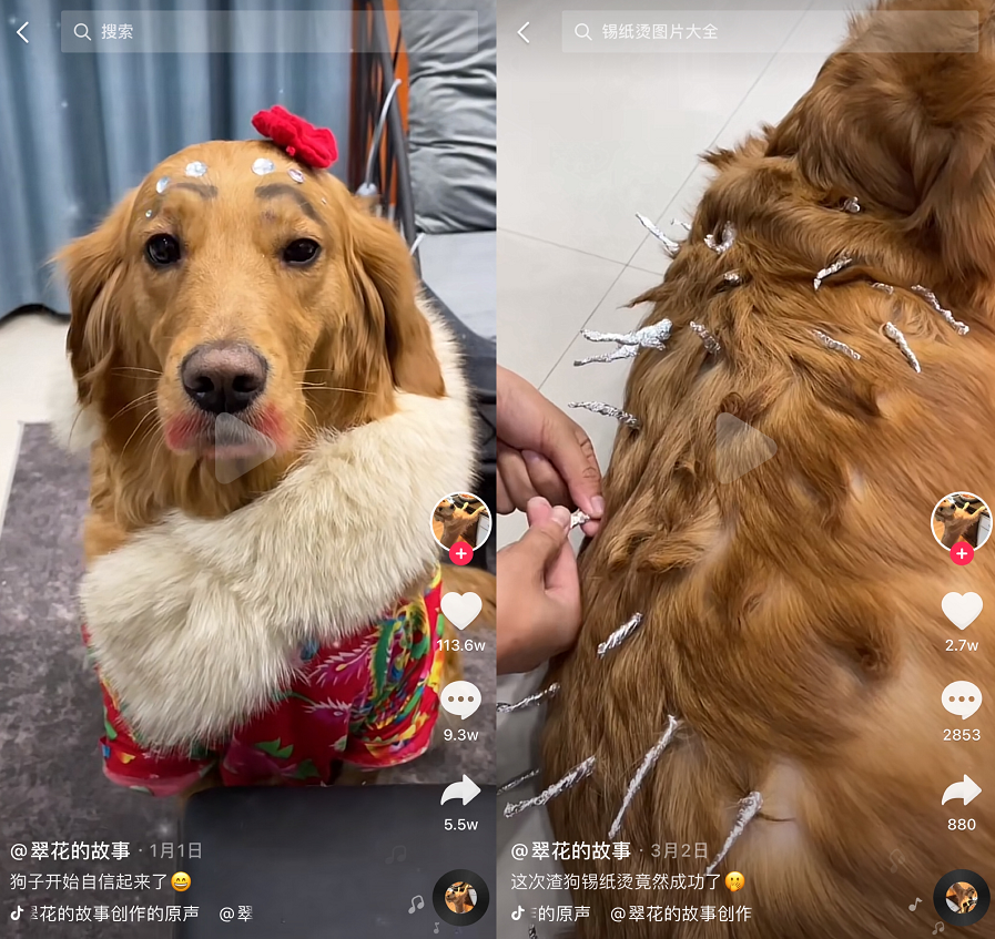 在抖音号“翠花的故事”中,主人给一只金毛画眉毛、夹睫毛、涂口红、锡纸烫,甚至涂上猩红的指甲油。视频中的金毛一副任主人摆弄、生无可恋的样子,评论区有用户留言“就喜欢看翠花这幽怨的小眼神”。