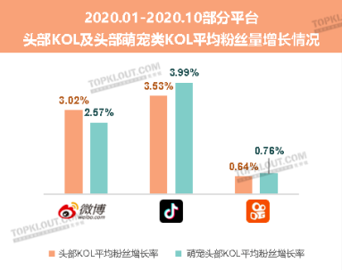 据克劳锐发布的《2020萌宠内容生态下的宠物经济》研究报告显示,2020年1-10月微博头部KOL平均粉丝增长率为3.02%,萌宠头部KOL的平均粉丝增长率为2.57%;抖音头部KOL平均粉丝增长率为3.53%,而萌宠头部KOL的平均粉丝增长率为3.99%;快手头部KOL平均粉丝增长率为0.64%,萌宠头部KOL的平均粉丝增长率为0.76%。
