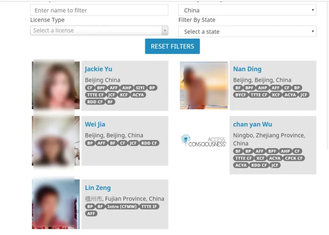 在AC官网,燃财经搜索了中国的认证导师,发现有五位坐标北京、宁波和福州的导师。其中一位名为Wei Jia的导师在自我介绍中表示,自己是一名心理咨询师,也是Access Bars导师、面部提升导师、基础课导师、金钱事业课导师、事业大师课导师以及关系经营课等等多种治疗方法的导师。