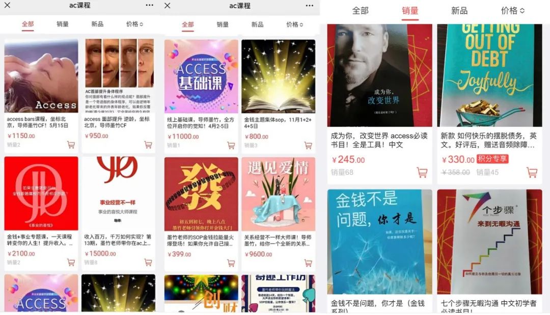 简单的沟通之后,Wei Jia给燃财经发来了一个名为“轩奕书院Access书店”的微店链接。正如Wei Jia在自述中所说,在其发来的微店中,除了Access Bars课程之外,还包括价格1900元的面部提升、3000元的金钱+事业专题、9600元的关系经营,以及价格飙升至11000元和15000元的线上基础课与事业大师课等Access的其他课程。