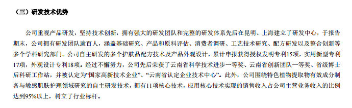 伴随国潮崛起,国货化妆品凭借着自身过硬的品质,正在逐渐摆脱以价取胜的刻板印象,据薇诺娜母公司贝泰妮2020年财报显示,其围绕特色植物提取物有效成分制备与敏感肌肤护理领域研究的自主研发技术,拥有11项核心技术,应用核心技术实现的销售收入占公司主营业务收入的比例达到95%以上。在产品研发投入上的付出和对品牌质量的自信,给了国货美妆品牌敢于转变原有发展路径,走上高端路线的底气。