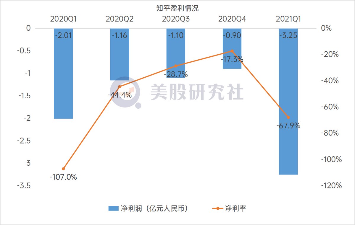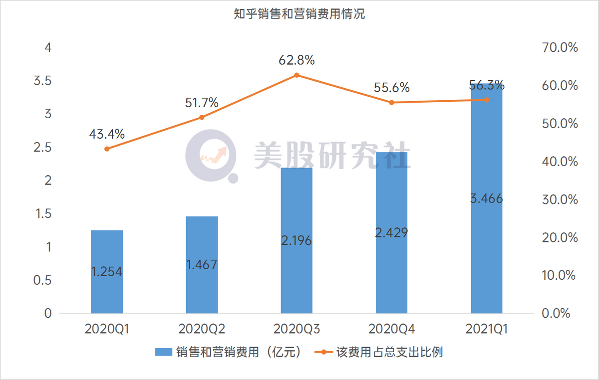 Q1季度,知乎净亏损3.247亿元,比去年同期的2.013亿元同比扩大61.3%。这主要是由于2021年Q1运营支出总额高达6.151亿元人民币,而2020年同期为2.892亿元人民币。其中的大头是销售和营销费用,占比为56.3%。