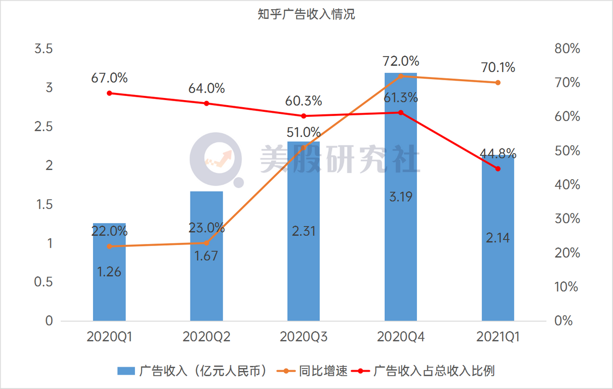 营收的增长是由于业务的全面增长,具体到收入结构上,首先是广告业务的发展,Q1财季知乎实现广告营收2.14亿元,同比增长70.1%,值得注意的是,本财季知乎广告收入占总收入比例由去年同期的67%下降到44.8%。