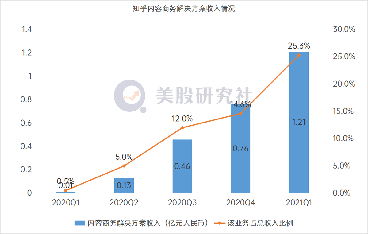一个新的收入结构亮点是知乎内容商务解决方案“知+”的发展,它创新地以内容作为广告蓝本,利用知乎回答的长尾流量实现长期广告。Q1季度知乎实现内容商务解决方案收入1.21亿元,占总收入比例攀升至25.3%。