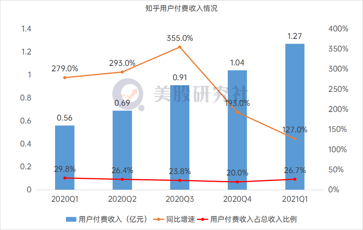 在付费会员收入上,知乎实现了连续五个季度的增长,Q1季度实现用户付费收入1.27亿元,同比增长127%,占总收入比例为26.7%,季度付费会员平均达到398万人,同比增长138%,用户付费率达到4.7%。