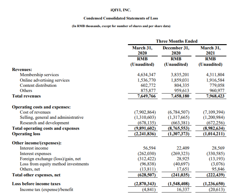 净亏损收窄的功劳要归功于内容成本的下降。第一季度爱奇艺的内容成本为54亿元,与2020年同期相比下降了8%。