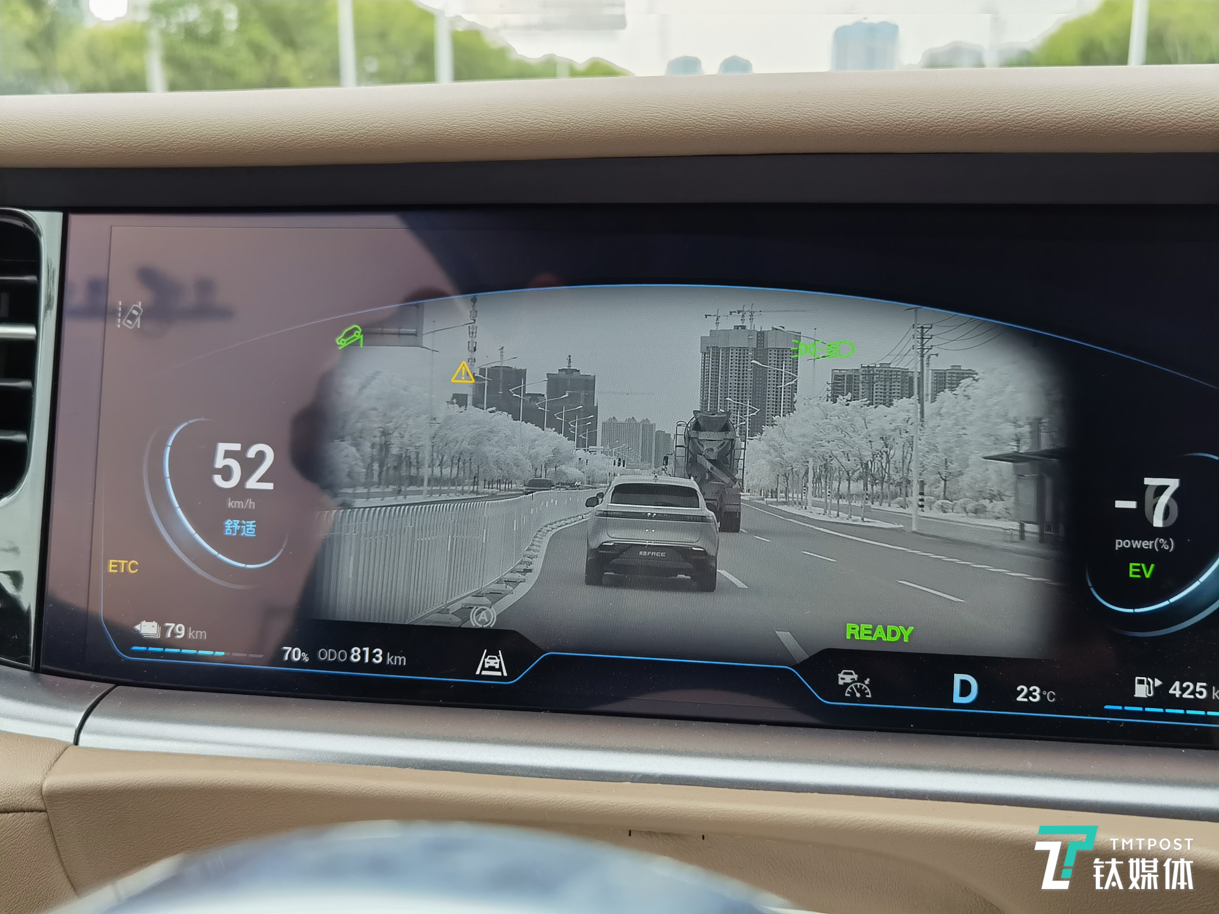 另一个很不错的功能是红外夜视仪。在方向盘的右侧有一个独立按钮,启动后,可以在主驾屏幕上显示红外夜视仪内容,清晰度非常高,对于夜晚行车提供安全很有帮助。