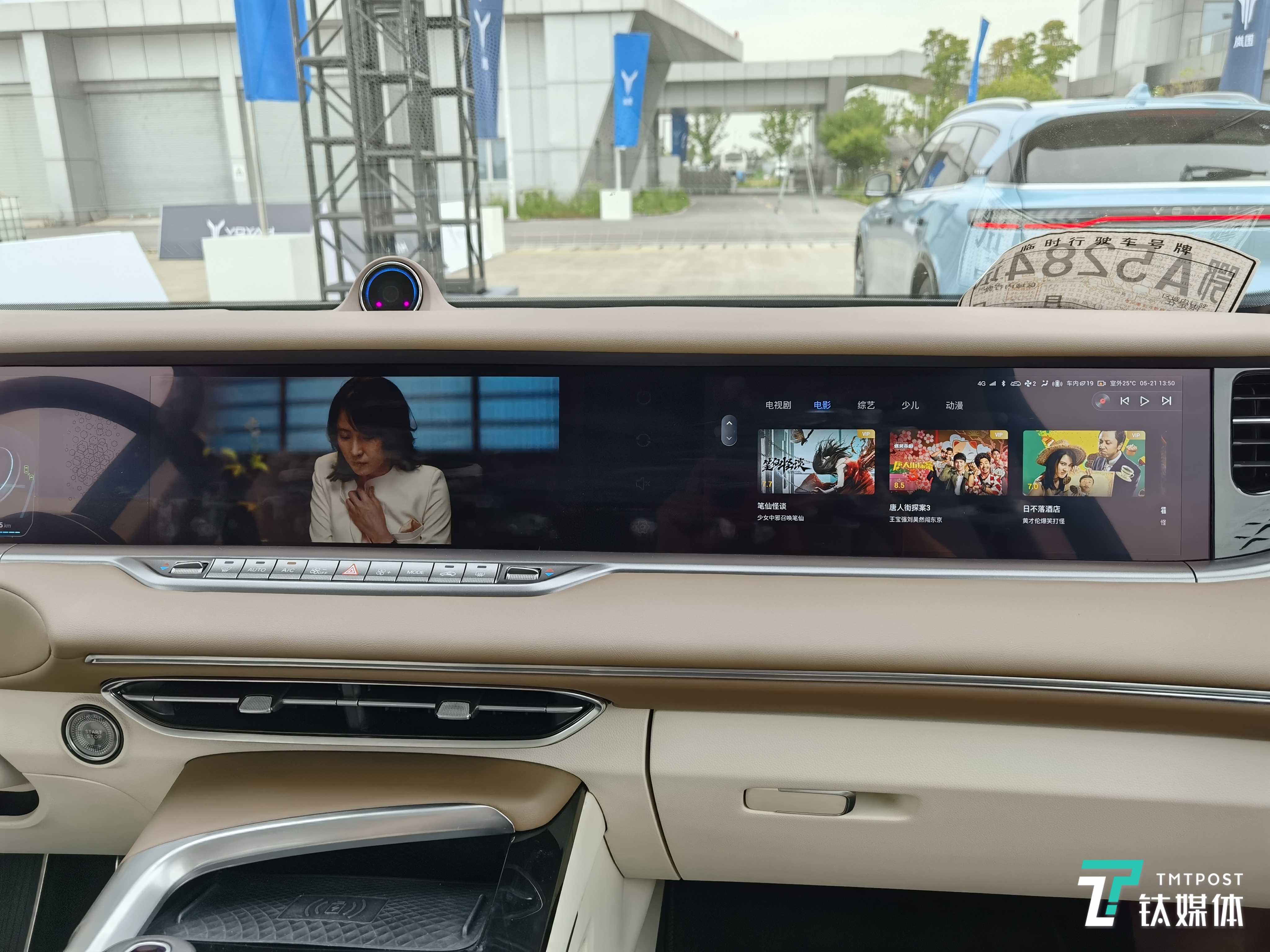 三屏之间的互动也非常方便和灵活,只需要用三指滑动的方式,就可以将副驾屏幕上播放的影片甩到中控屏幕上,也可以将中控屏幕上的导航地图甩到主驾屏幕上。副驾屏幕和中控屏幕的内容拖动非常流畅,没有卡顿,但中控和主驾之间的屏幕内容拖拽还有优化的空间,目前体验上还有一些不够流畅。