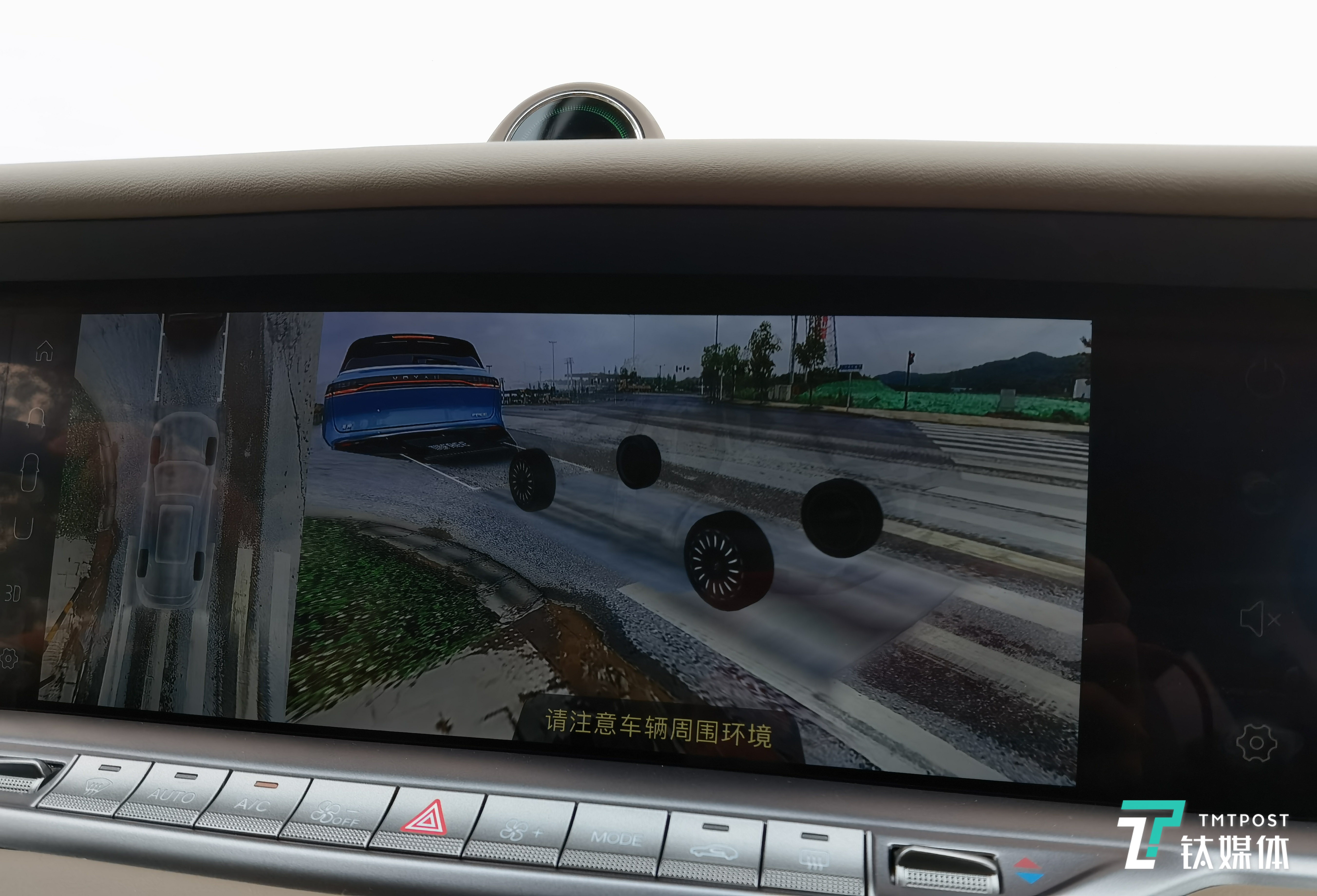 岚图FREE在道路实际中,我们体验了一个特色功能,叫做透明底盘。可以理解为360全景影像的加强版,通过摄像头将车身下方的路面也进行抓取,并将车身透明化。带来的好处是可以很清楚看到4个轮子所在的位置,在通过一些狭小空间,对于车辆的操控会更加准确。