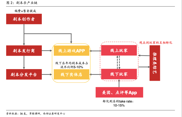 目前剧本杀的产业链上,编剧创作剧本,发行商发行剧本,分发平台售卖剧本,店家购买剧本和提供场地/服化道,最后是玩家玩本。