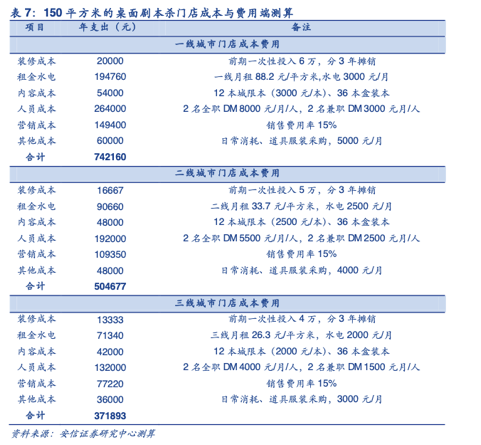60万的投入,大体规模是150平的店面,根据安信证券的研报显示,主要费用为固定成本+人员工资+营销成本。