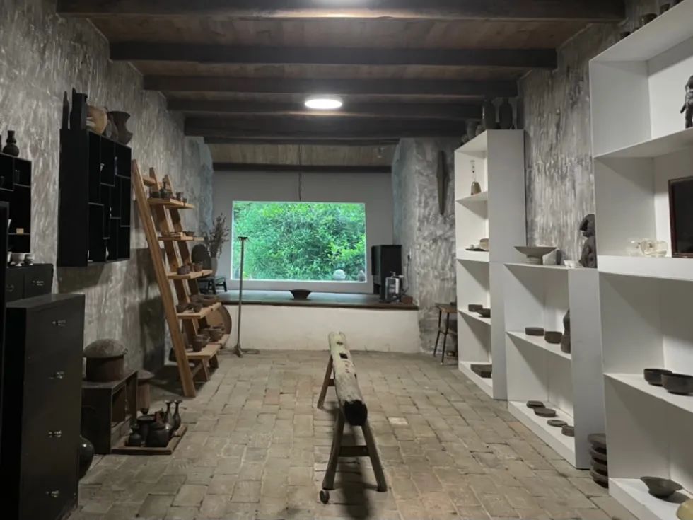 其弈和陈知音的工作室在一个离陶艺街较远的山野村庄,流坑坞。他们租下了一桩民房将其改造成自己的陶艺工作室,整栋房子都是木质结构,门口就是大片的绿野。夕阳照进来,有种辽阔深远的感觉。房子不小,多余的两间做了民宿,还有一间展厅和周末咖啡馆。