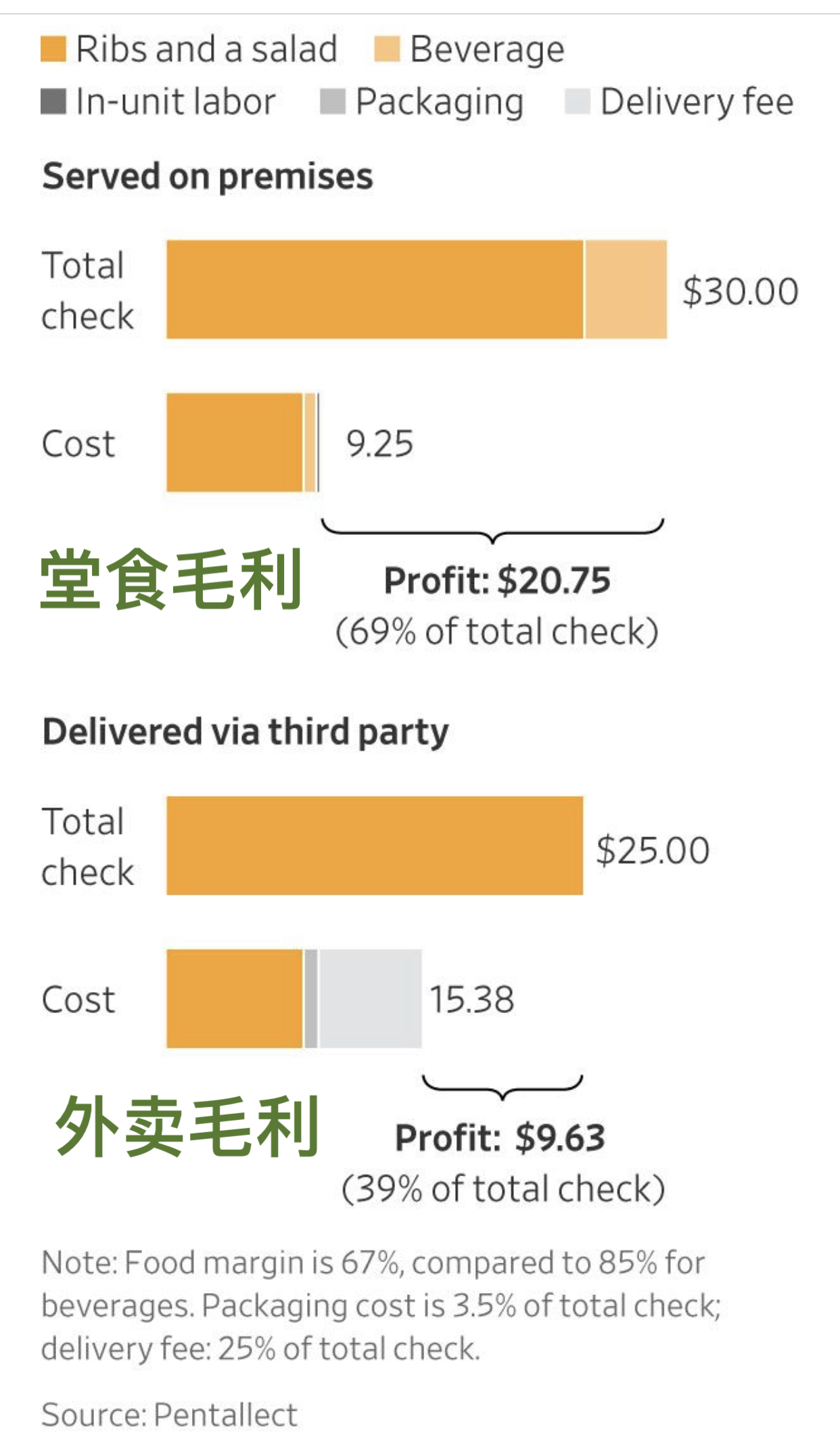 一位华人网友说,疫情初期他在美国连续点了5个月外卖,算下来比平时去同样店铺堂食贵了50%。美国餐饮咨询机构Pentallect曾针对餐厅的堂食和外卖成本结构做过分析(图),堂食订单包括主食和饮料,一共30美元,商家毛利高达20.75美元;而外卖订单假设不点饮料,花费25美元,其配送费+包装费基本与食物成本相当,商家毛利降至9.63美元。