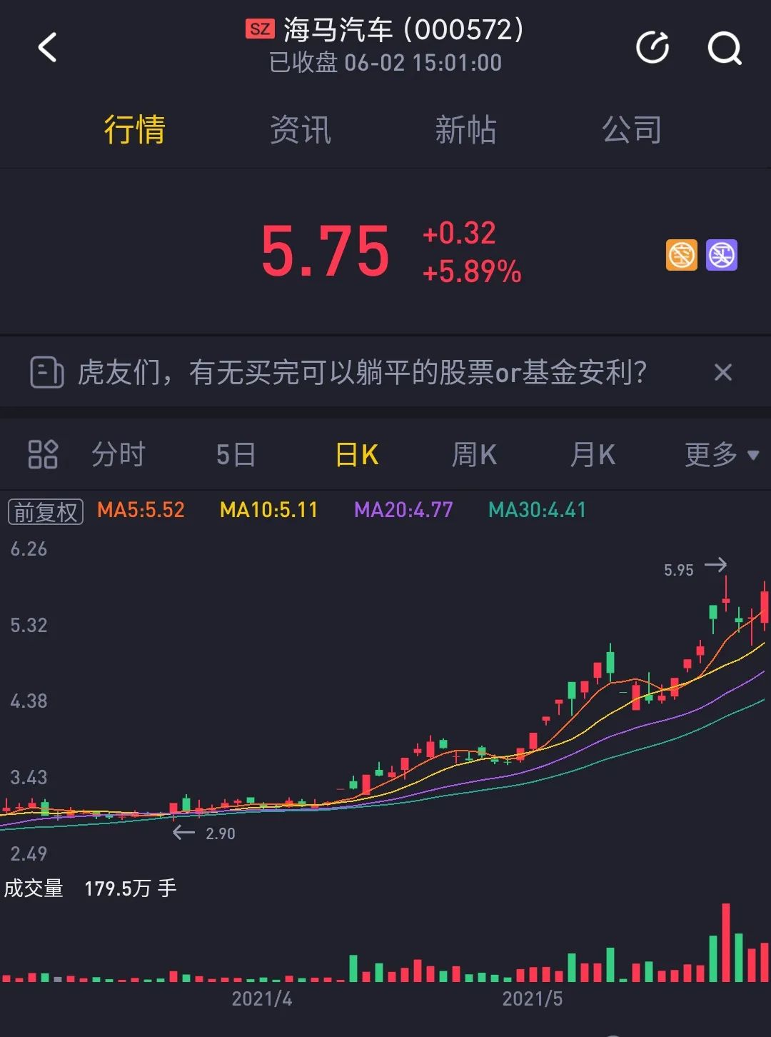 这也是其继去年6月从即将退市的“*ST海马”变为“ST海马”后又一利好消息。受此影响,海马汽车的股价从5月25日收盘时的5.07元/股涨至今日收盘价的5.75元/股。