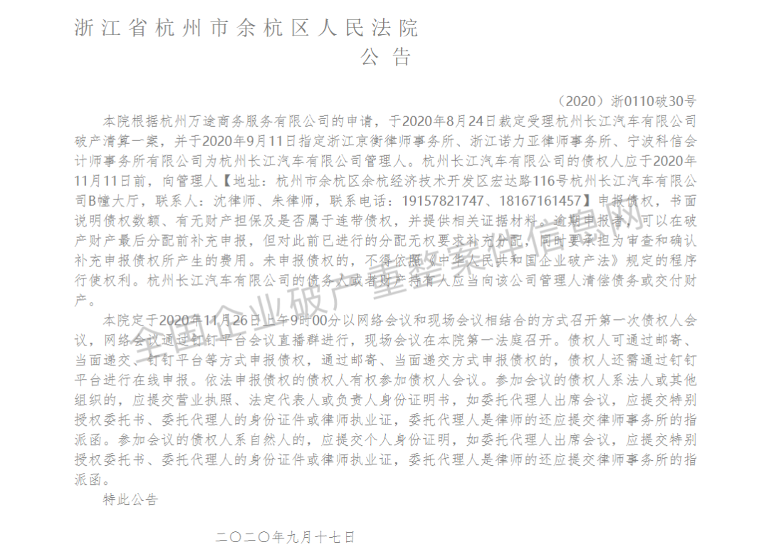 去年9月,杭州市余杭区人民法院发布了一份关于长江汽车的破产文书,据文书显示,该法院裁定受理长江汽车有限公司破产清算一案,并勒令长江汽车相关债权人于当年11月申报相关材料和证据。