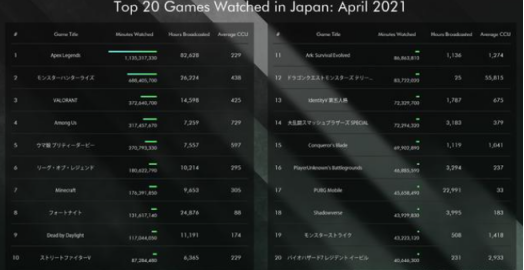 但APEX和Valorant却在日本收获了成功。得益于直播和虚拟偶像等因素带动,根据日本调查机构 Giken Access 发表了新的一份报告,通过收集了包括 Youtube、Twtich 等直播平台中日文台数据,记录了75000 次以上的直播观看时数,《APEX 英雄》连续 12 个月拿下了观看时数的第一名,而Valorant位列第三。
