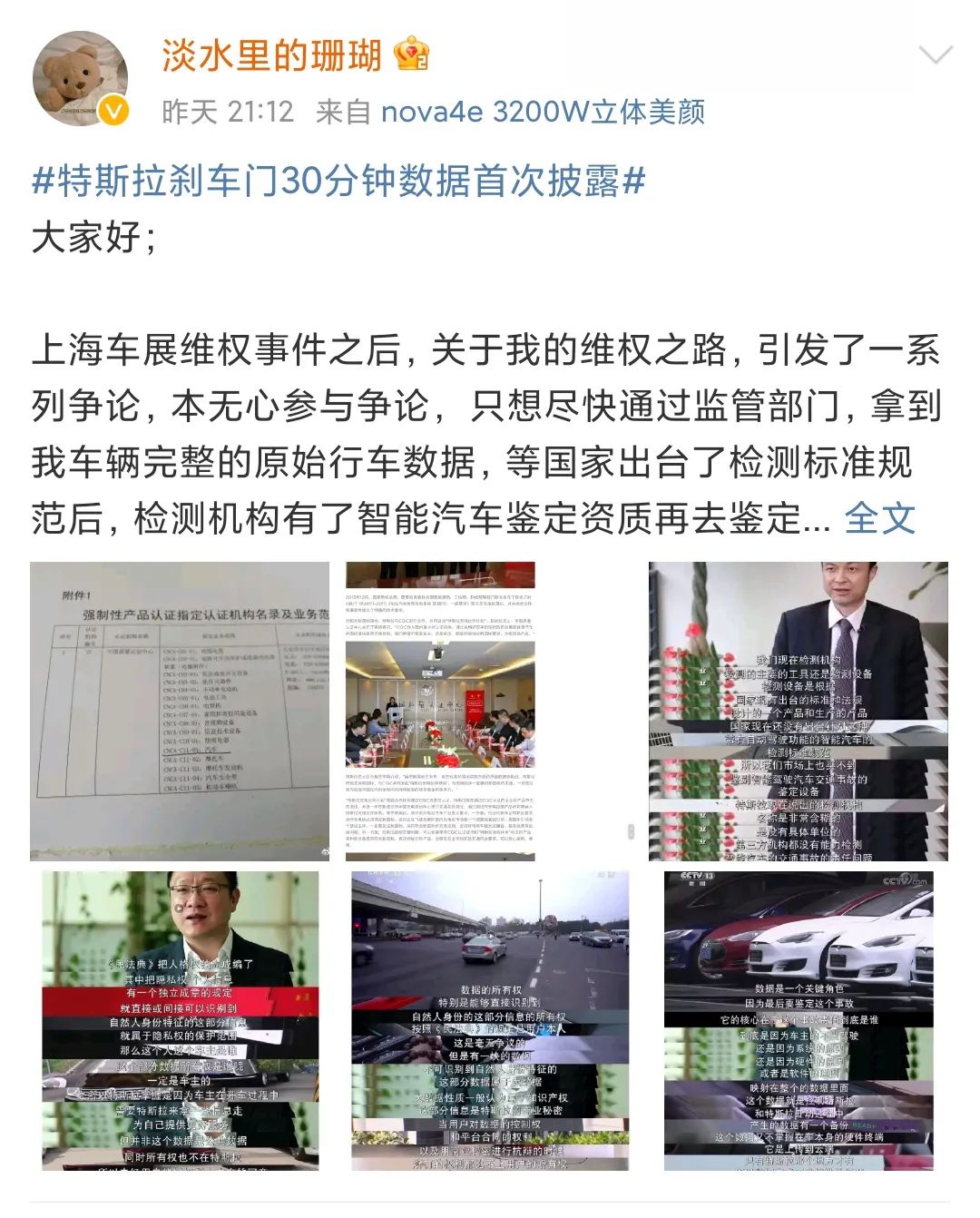 特斯拉维权女车主最新微博,截图自其微博