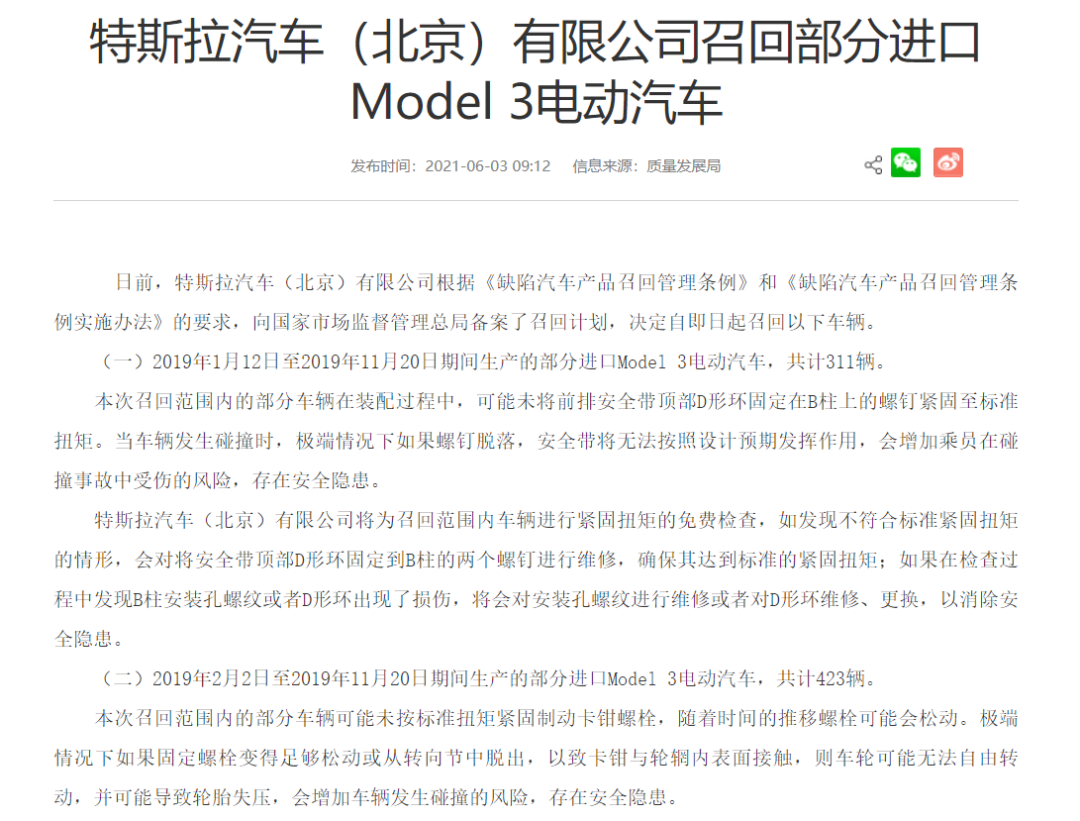 近日,特斯拉中国应相关国内法律法规要求,向国家市场监督管理总局备案了召回计划,决定召回2019年生产的部分进口Model 3车辆,并表示召回原因是由于这部分车辆安全带和车辆制动装置存在问题,易造成隐患。