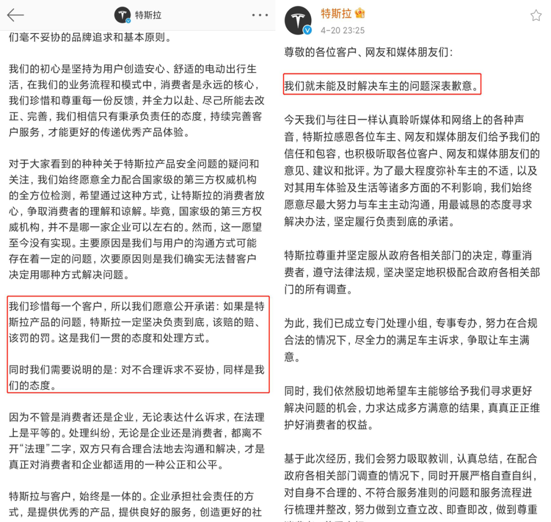 今年4月20日晚,一封以“我们就未能及时解决车主的问题深表歉意”的道歉信出现在特斯拉官方微博中。在道歉信中,特斯拉表示将认真聆听媒体和网络上的一切声音,并在最后再次对车主致歉。