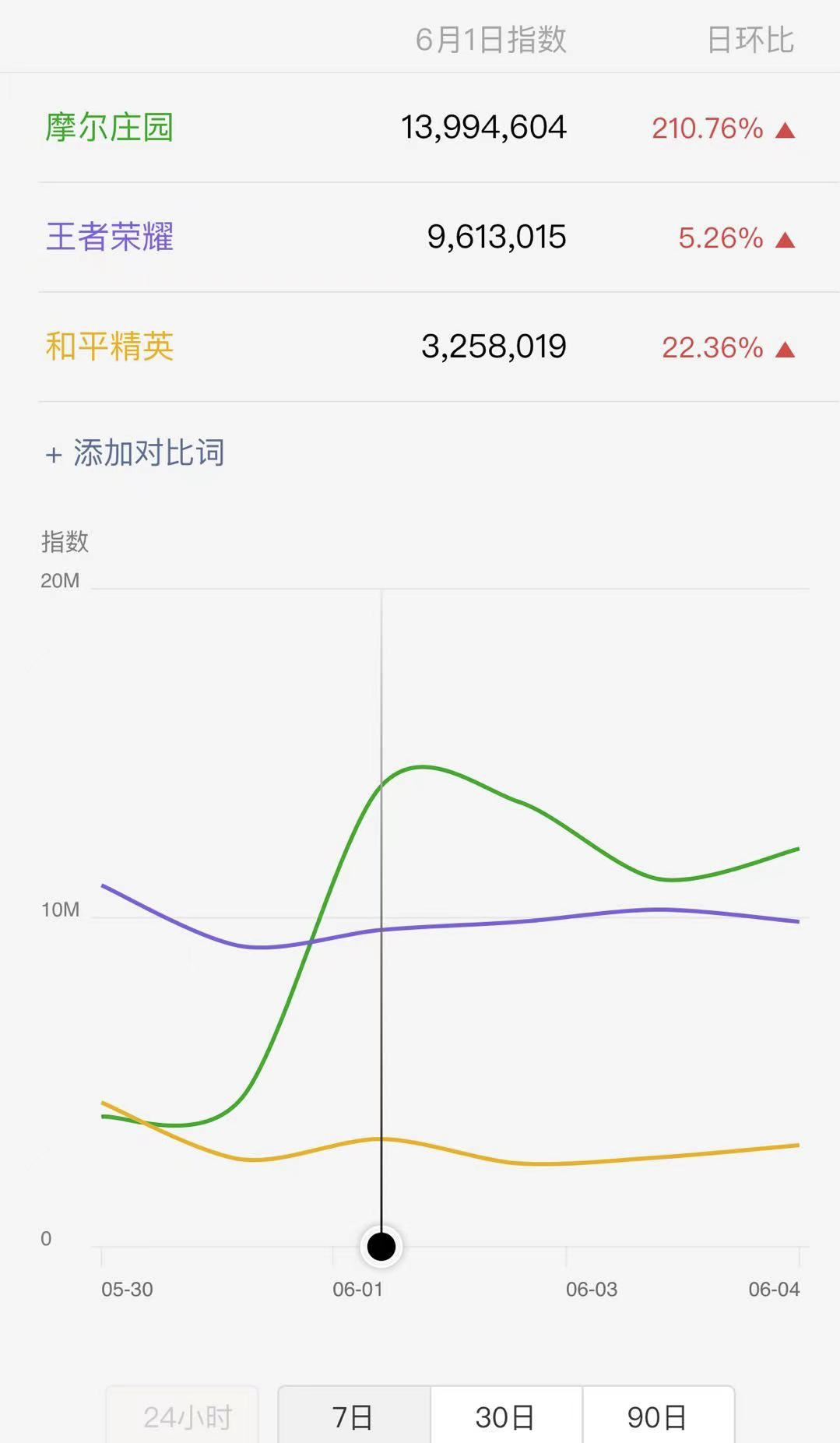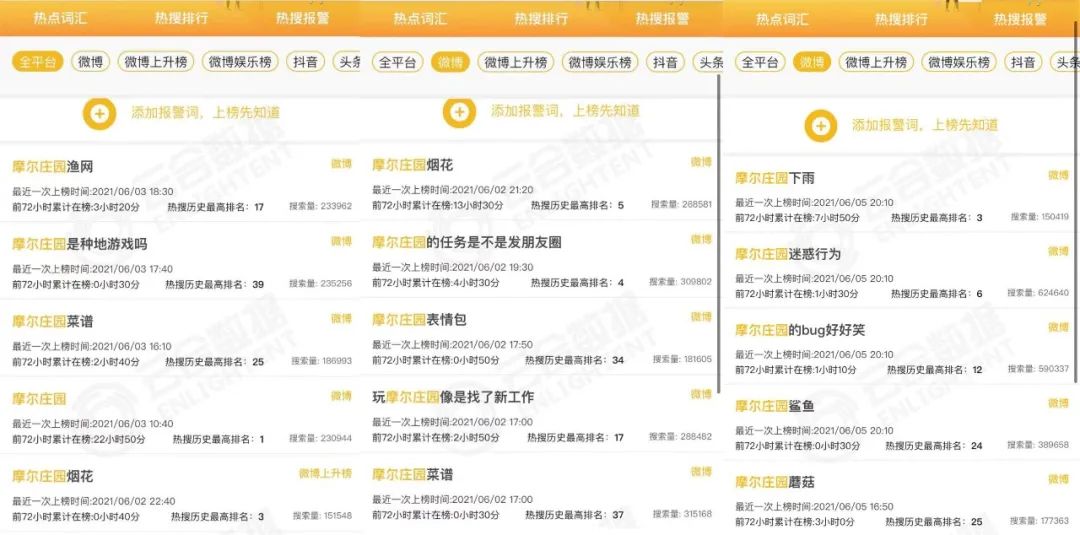 微博上《摩尔庄园》手游相关的热搜,6月2日有5条,6月3日有4条,6月5日有5条。其中6月3日“摩尔庄园”词条是热搜第一。