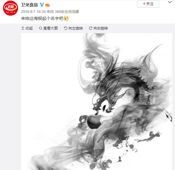 历年来苹果发布会都是科技圈头条,2016年iPhone 7发布会风头却被卫龙抢了去。卫龙想蹭苹果的心蠢蠢欲动,提前发布一张海报,画面里一条身姿矫健的龙意欲吞下一个苹果。