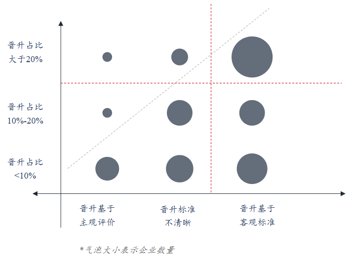 从晋升结果来看,约63.9%的企业晋升率低于20%。我们的经验是,一个企业的晋升率如果低于这个数据,那么,其人才队伍就是没有正常流动的,一定会有某种程度的“气血不畅”。