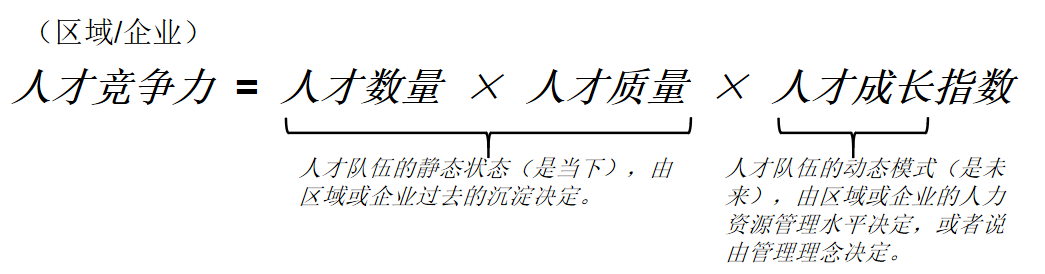我们认为,无论是区域还是企业的人才竞争力,都应该是人才数量、人才质量和人才成长指数综合乘数效应的结果。人才数量和质量反映的是当下人才队伍的静态状态,由区域或企业过去的沉淀决定。而人才成长指数则是人才队伍的动态模式,反映的是未来的表现,由区域或企业的人力资源管理水平决定,或者说由管理理念决定。