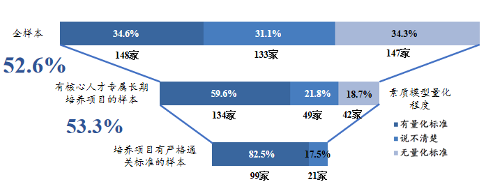 一方面,有52.6%的企业有针对核心人才的长期培养项目;在此基础上,只有53.3%的企业有严格的培养通关标准;而这其中,仅只有82.5%的企业通过素质模型来量化培养效果。