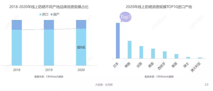 目前,市场上使用最广的还是进口防晒产品,根据CBNData数据显示,2020线上防晒产品进口品牌消费规模占比超8成。