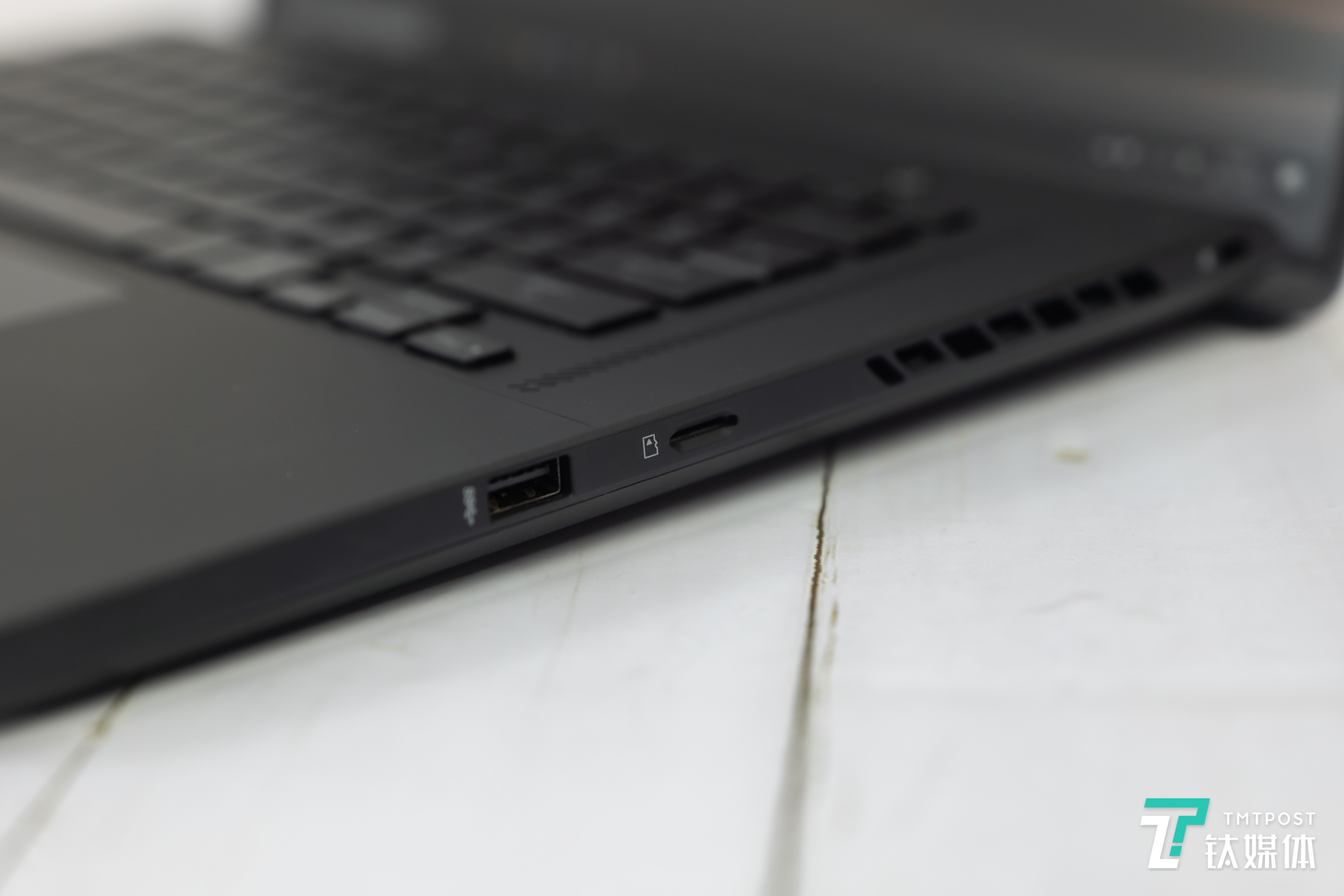 此外,笔记本侧面的接口也是一应俱全:左侧有HDMI 2.0b接口和LAN网线接口,雷电4接口,USB-A 3.2 Gen2和USB-C 3.2 Gen2接口以及3.5mm耳机/麦克风接口;右侧则有一个Micro SD读卡机以及 USB-A 3.2 Gen1接口。