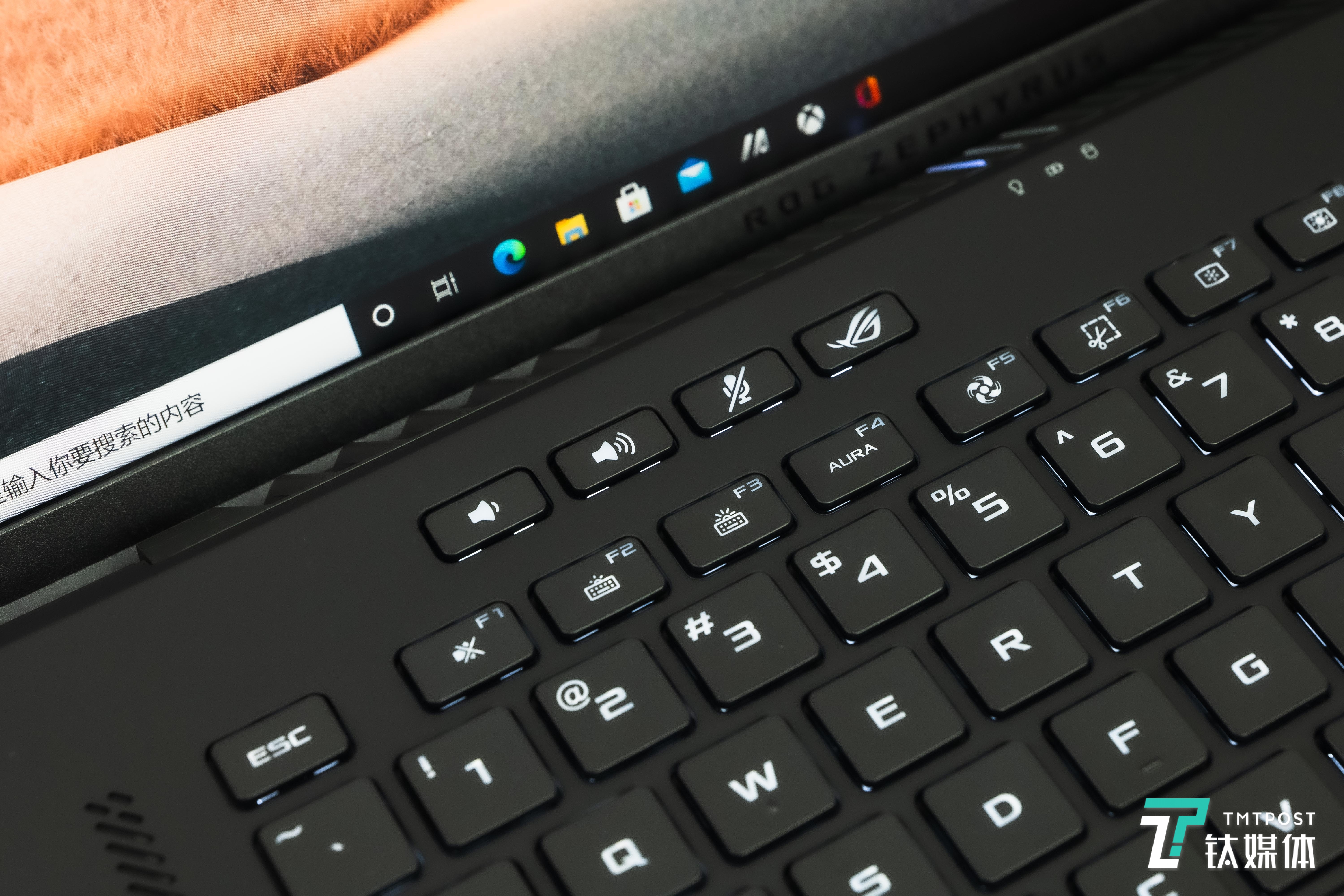 键盘的上方还单独留出了四颗常用的功能按键,分别是音量+/-、麦克风静音和ROG键(一键启动Armoury Crate奥创智控中心)启动)。至于指纹识别模块则是被集成在了电源启动按键上。